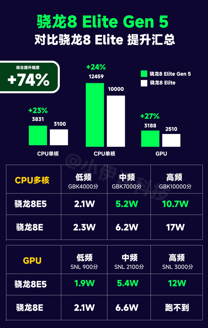 3、骁龙8 Elite Gen 5这边,CPU单核提升23%,CPU多核提升24%,GPU提升27%,这三个还真比较平均。不过需要注意的是,虽然峰值性能提升不少,在中低频场景的能效比提升幅度非常有限。